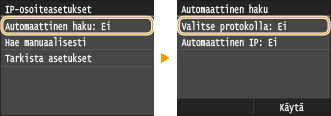 ![]() Jos <Kyllä> näytetään, napauta kohtaa <Automaattinen haku> ja aseta sekä <Valitse protokolla>- että <Automaattinen IP> -asetukseksi <Ei>.