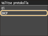 Napauta <Ei>. Jos napautetaan <DHCP>, kun tämä palvelu ei ole käytettävissä, laite hukkaa aikaa ja tiedonsiirtoresursseja etsiessään tätä palvelua verkosta.