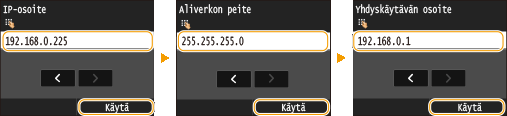 <Aliverkon peite> <Yhdyskäytävän osoite>.Syötä kukin asetus numeropainikkeilla ja napauta kohtaa <Käytä>.