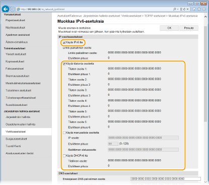 Laitteen IPv6-osoitteet voidaan määrittää etäkäyttöliittymän avulla. Tarkista IPv4-osoiteasetukset ennen IPv6-osoitteiden asettamista (IPv4-asetusten näyttäminen). Sinun on asetettava oikeat IPv4-asetukset, että voit käyttää IPv6-osoitteita. Huomaa, että skannaustoiminto, joka käyttää skanneriajuria tai MF Scan Utility -ohjelmaa, ei ole käytettävissä IPv6-ympäristössä. Laite voi käyttää enintään yhdeksää seuraavista IPv6-osoitteista: