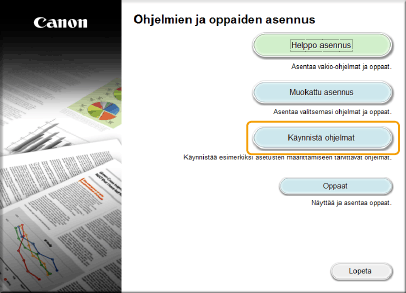 ![]() ![]() Jos yllä olevaa näyttöä ei näytetä, katso [Ohjelmien ja oppaiden asennus]-näytön näyttäminen.