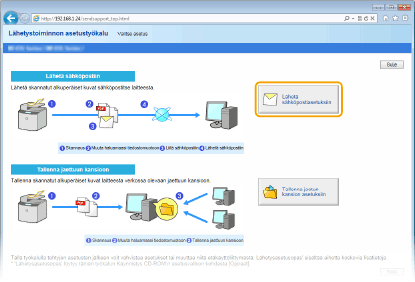 Lähetystoiminnon asetustyökalulla voidaan määrittää sähköpostien peruslähetysasetukset. Lähetystoiminnon asetustyökalun sijaan voidaan käyttää etäkäyttöliittymää lisäasetusten määrittämiseen, esimerkiksi POP-autentikointi ennen lähetystä -asetukset tai salattu tiedonsiirto. Sähköpostin/I-faksin tiedonsiirtoasetusten määrittäminen