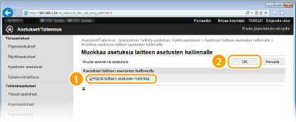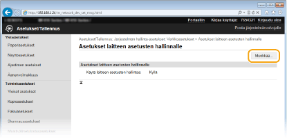 iW Management Console-ohjelmiston lisäosien käyttäminenVaratun portin asetukset ja SNMP-asetukset täytyy ottaa käyttöön. Valitse SNMP-asetuksissa [MIB-pääsyoikeus] -asetukseksi [Luku/Kirjoitus] sekä SNMPv1- että SNMPv3-lisäosaa varten.