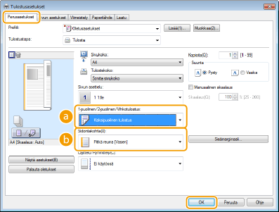 Voit tulostaa sekä 1-puolisesti että 2-puolisesti. Oletusasetus on [Kaksipuolinen tulostus]. Vaihda asetus tarvittaessa.