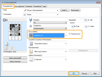 Julisteen kokoasetuksia ei voi valita, kun 2-puolinen tulostus on käytössä. Valitse [Yksipuolinen tulostus] kohdassa [1-puolinen/2-puolinen/Vihkotulostus] ja valitse sitten julisteen kokoasetus.