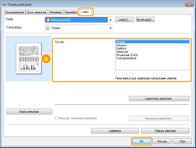 Määritä lisäasetukset kullekin valitulle [Tavoite]-kohdan asetukselle valitsemalla [Laajennetut asetukset]. Lisätietoja saat valitsemalla tulostinajurinäytön kohdan [Ohje].