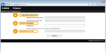 Voit käyttää kaikkia etäkäyttöliittymän toimintoja ja asetuksia. Jos järjestelmänvalvojan tunnus on määritetty, syötä oikea tunnus kenttään [Järjestelmänvalvojan tunnus] ja oikea PIN-koodi kenttään [Järjestelmänvalvojan PIN].