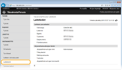 Tiedot laitteesta ja järjestelmänvalvojasta näytetään. Nämä tiedot asetetaan [Asetukset/Tallennus]-sivun kohdassa [Järjestelmän hallinta].