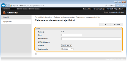 Voit tehdä määritykset [ECM-lähetys] ja [Nopeus] myös käyttöpaneelin kohdassa <Faksiasetukset> ( Faksiasetukset (MF419x / MF416dw)). Kohdassa <Osoitekirja> tehdyt asetukset ovat kuitenkin käytettävissä osoitekirjaan tallennettujen vastaanottajien tarkkoja asetuksia varten.