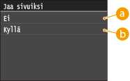 Jos kohdassa <Tiedostomuoto> valitaan JPEG, vain yksi sivu voidaan skannata, kun asiakirja asetetaan valotuslasille. Jos haluat skannata useita asiakirjoja kerralla, aseta ne syöttölaitteeseen. Asiakirjan jokainen sivu skannataan ja tallennetaan erillisenä tiedostona. Jos valitaan TIFF- tai PDF-muoto, monisivuisia asiakirjoja voidaan skannata joko valotuslasilta tai syöttölaitteesta. Tällöin Asiakirjan jakaminen sivu kerrallaan useisiin tiedostoihin ‑asetuksella voidaan määrittää, tallennetaanko koko skannattu asiakirja yhtenä tiedostona vai useina tiedostoina sivu kerrallaan.