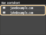 Jos katkaiset laitteesta virran tai asetat <Rajoita uusia vastaanottajia> -asetuksen arvoksi <Kyllä>, aiemmat vastaanottajat poistetaan ja tämä toiminto poistetaan käytöstä. Käytettävissä olevien vastaanottajien rajoittaminen