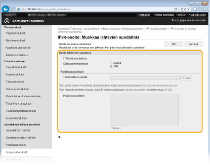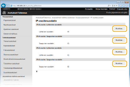 Jos IP-osoitteet on syötetty väärin, et ehkä pysty käyttämään laitetta etäkäyttöliittymästä, missä tapauksessa sinun on valittava <IPv4-osoitesuodatin>- tai <IPv6-osoitesuodatin>-asetukseksi <Ei>.