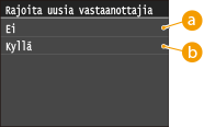 Rajoittamalla asiakirjojen lähetykseen käytettävissä olevia faksinumeroita niihin, jotka on jo tallennettu osoitekirjaan tai joita on käytetty aiemmin tai jotka voidaan hakea LDAP-palvelimilta, voit pienentää mahdollisuutta valita vääriä vastaanottajia sekä estää käyttäjiä vuotamasta tietoja. Kun tämä toiminto on käytössä, laite estää käyttäjiä syöttämästä vastaanottajia numeropainikkeilla, lisäämästä uusia tietoja osoitekirjaan ja muokkaamasta olemassa olevia osoitekirjan tietoja.