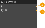 HTTP:tä käytetään tiedonsiirtoon verkon kautta, esimerkiksi silloin, kun laitetta käytetään Etäkäyttöliittymällä. Jos käytät USB-yhteyttä tai et muuten käytä HTTP:tä, voit poistaa HTTP:n käytöstä ja näin estää kolmannen osapuolen hyökkäykset käyttämättömän HTTP-portin kautta.