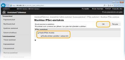 Käyttöpaneelin käyttäminenVoit ottaa IPSec-tiedonsiirron käyttöön tai poistaa sen käytöstä myös kohdassa <Valikko>, joka on Koti-näytössä. Käytä IPSec-muotoa