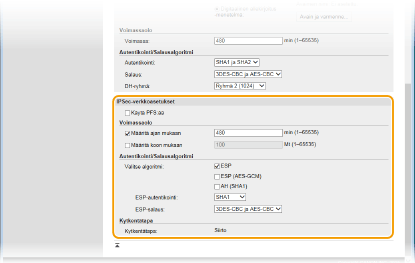 Ota ESP-todennus käyttöön valitsemalla hash-algoritmiksi [SHA1]. Valitse [Älä käytä], jos haluat poistaa ESP-todennuksen käytöstä.
