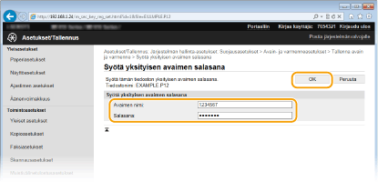 Syötä avainparin nimi ja salasana ja valitse [OK].