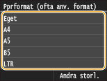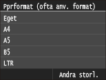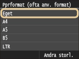 Om ovanstående skärm inte visas när papper fylls påOm du alltid fyller på samma papper i multiutmatningsfacket kan du hoppa över pappersinställningarna genom att registrera pappersformatet och -typen som standardinställningar. När standardinställningarna har registrerats visas emellertid inte ovanstående skärm. Om du vill visa skärmen väljer du <Ange när du matar in papper> (Registrera inställningar för standardpappersformat för multiutmatningsfacket).