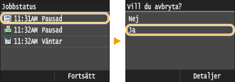 Dokument har skannats och väntar på utskrift. Välj vilket dokument som ska avbrytas.