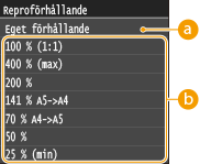 Du kan förstora eller förminska kopior genom att använda ett förinställt reproförhållande, till exempel <A5->A4>, eller genom att ställa in en anpassat reproförhållande i steg om 1 %.
