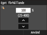 eller sifferknapparna för att ange kopieringsförhållandet och tryck på <Använd>. Du kan ange reproförhållanden från 25 till 400 % i steg om 1 %.