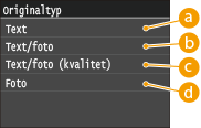 Du kan välja optisk bildkvalitet för kopian beroende på dokumenttypen, till exempel dokument med bara text, dokument med diagram och kurvor eller tidskriftsfoton.