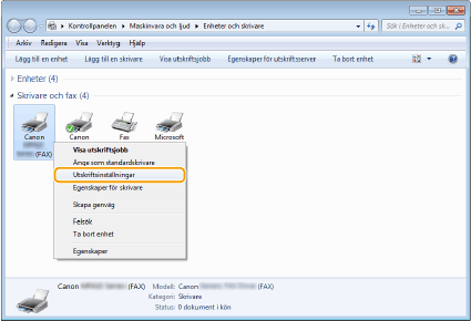Högerklicka på ikonen för enhetens faxdrivrutin och klicka på [Utskriftsinställningar].