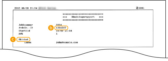 När det gäller e-postmeddelanden anger sändningsrapporter överföringsresultatet mellan enheten och e-postservern och inte mellan enheten och mottagaradresserna. Trots att överföringen avbryts skrivs en tresiffrig felkod inte ut. Om du vill kontrollera felkoden skriver du ut en kommunikationshanteringsrapport (