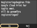 Du kan även registrera enheten från en mobil enhet eller Google Chrome*. Enhetens skärm visar följande bekräftelseskärm innan registreringen slutförs. Tryck på <Ja> för att avsluta registreringen.