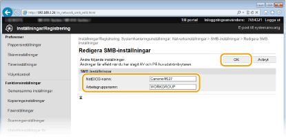 Arbetsgruppsnamn är ett namn för att gruppera flera datorer så att grundläggande nätverksfunktioner, till exempel fildelning, blir tillgängliga i ett Windows-nätverk. Ange arbetsgruppsnamnet för att identifiera den grupp som enheten hör till.