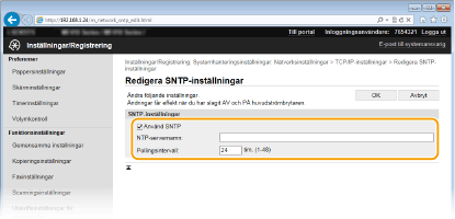 Med SNTP (Simple Network Time Protocol) kan du justera systenklockan genom att använda tidsservern på nätverket. Protokollet används vanligtvis för synkronisering av enheten och en server, till exempel när enheten måste ha åtkomst till en LDAP-server med den säkerhetsautentisering som har aktiverats. Tiden justeras baserat på UTC (Coordinated Universal Time) och du måste ange tidszonsinställningar innan du konfigurerar SNTP (Datum-/tidsinställningar). Du kan ange SNTP-inställningar via Fjärranvändargränssnittet.
