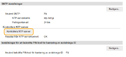 [Nätverksinställningar] [TCP/IP-inställningar] och sedan på [Kontrollera NTP-server] i [SNTP-inställningar] som visas. Om en korrekt anslutning har upprättats visas resultatet enligt nedan. Den här åtgärden justerar inte systemklockan.![]() |