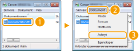 Avbryta från gränssnittet för fjärranvändningDu kan avbryta utskriften från sidan [Jobbstatus] i Fjärranvändargränssnittet: Kontrollera aktuell status för utskriftsdokument