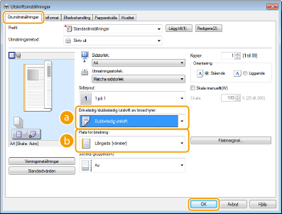 Välj [Enkelsidig utskrift] eller [Dubbelsidig utskrift] i [Enkelsidig/dubbelsidig/utskrift av broschyrer]