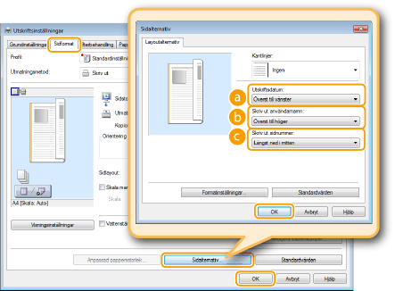 [Sidformat] fliken Klicka på [Sidalternativ] Välj utskriftsposition för utskriftsdatum, användarnamn och sidnummer [OK]  [OK]