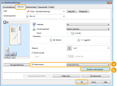 Du kan skriva ut vattenstämplar, till exempel "KOPIA" eller "KONFIDENTIELL", över dokumentet. Du kan skapa nya eller använda förregistrerade vattenstämplar.
