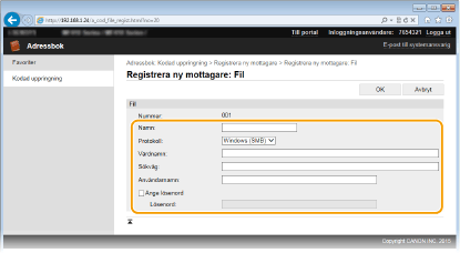 Du kan använda en dator för att registrera mottagare i enhetens adressbok samt redigera information om registrerade mottagare. Ange den delade mappen/FTP-serverdestinationen här.