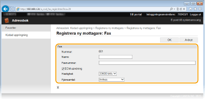 Du kan även ange [ECM-sändning] och [Hastighet] från <Faxinställningar> ( Faxinställningar (MF419x / MF416dw)) på kontrollpanelen. Inställningar gjorda från <Adressbok> är dessutom aktiverade för de detaljerade inställningarna för mottagare som registrerats i adressboken.