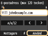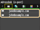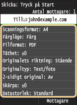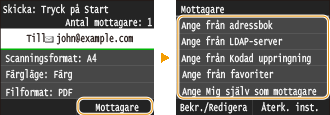 När du anger flera mottagare måste den andra och efterföljande mottagare vara registrerade i adressboken eller på en LDAP-server. Cc/Bcc-mottagare måste vara registrerade i adressboken för att kunna anges. Om du vill använda adressboken eller en LDAP-server måste du genomföra nödvändig registrering i förväg.