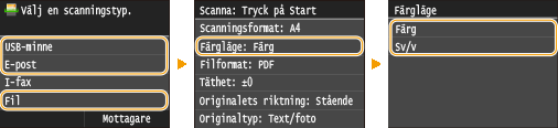 Välj <USB-minne> eller ange en mottagare med <E-post>/<Fil>
