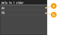 Om du väljer JPEG i <Filformat> och försöker att skanna ett dokument från originalglaset kan du endast skanna en sida. Använd mataren om du vill skanna flera sidor i taget. Varje sida i dokumentet sparas som en separat fil. Väljer du TIFF eller PDF kan du skanna flersidiga dokument antingen från originalglaset eller i mataren. I så fall kan du använda Dela upp sidorna i ett dokument i flera filer för att ange om hela det skannade dokumentet ska sparas i en fil eller om sidorna i dokumentet ska sparas i separata filer.