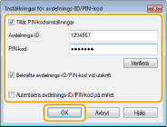 Markera kryssrutan för att visa pop-up-skärmen [Bekräfta avdelnings-ID/PIN-kod] varje gång du skriver ut eller faxar från datorn. [Autentisera avdelnings-ID/PIN-kod på enhet]