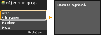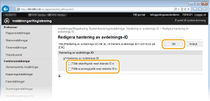 Markera kryssrutan för den funktion som du vill inaktivera för detta avdelnings-ID. ![]() Om [Scanna] kryssrutan är markerad är funktionerna Spara på USB-minne, Skicka e-post och Spara i delad mapp eller på FTP-server begränsade. Du kan också begränsa andra metoder som skannar dokument genom att importera dem till en dator, men i så fall kan du inte blockera åtkomst för respektive avdelnings-ID (Blockera jobb när avdelnings-ID är okänt).