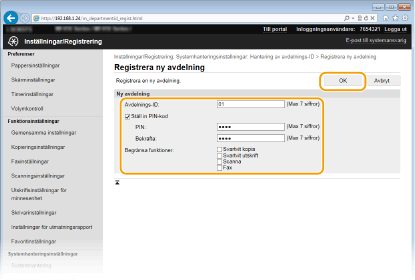 Markera kryssrutan för att aktivera PIN-kodsinställningen. [Avdelnings-ID]