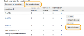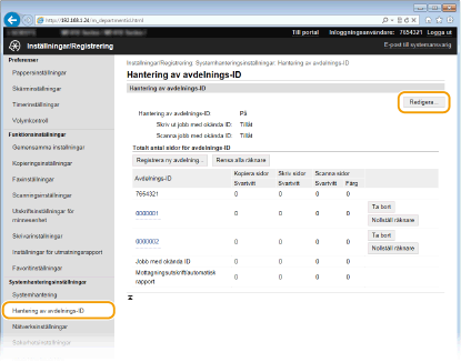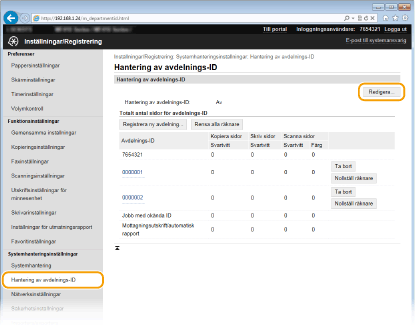 Om du vill nollställa antalet klickar du på länken under [Avdelnings-ID] och sedan klickar du på [Nollställ räknare]