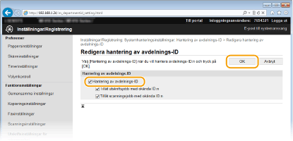 Klicka här för att bekräfta att rätt ID och PIN-kod har angetts. Om enheten och datorn är anslutna via en USB- eller WSD-port (Web Services on Devices) är funktionen inte tillgänglig. [Bekräfta avdelnings-ID/PIN-kod vid utskrift]/[Bekräfta avdelnings-ID/PIN-kod när du skickar fax]