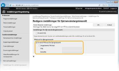 ![]() Använda kontrollpanelenDu har även åtkomst till inställningarna för fjärranvändargränssnittets PIN-kod från <Meny> på skärmen Hem. Inställningar för fjärranvändargränssnitt