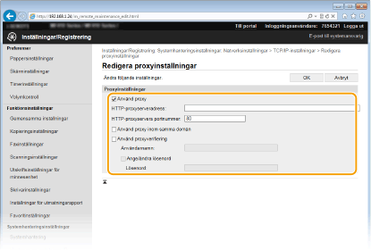 Markera kryssrutan [Använd proxy] och ange nödvändiga inställningar.