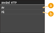 HTTP används för kommunikation över nätverket, till exempel när du använder enheten via Fjärranvändargränssnittet. Om du använder en USB-anslutning, eller på annat sätt inte använder HTTP, kan du inaktivera HTTP för att blockera intrång från personer med onda avsikter via den oanvända HTTP-porten.