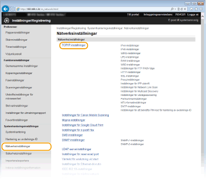 Klicka på [Nätverksinställningar] [TCP/IP-inställningar].